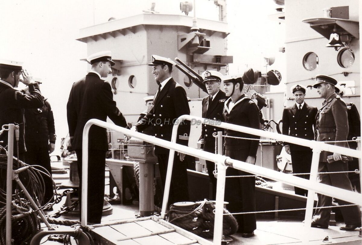 Prins Albert gaat aan boord van een eenheid van de Zeemacht en wordt begroet door de commandant van het schip en Kapitein ter Zee Jules DELFORGE;.