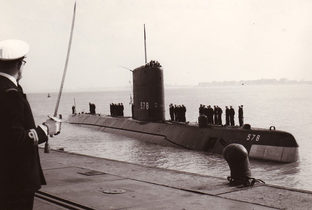 De Amerikaanse atoomduikboot U.S.S. Skate legt aan in Zeebrugge.