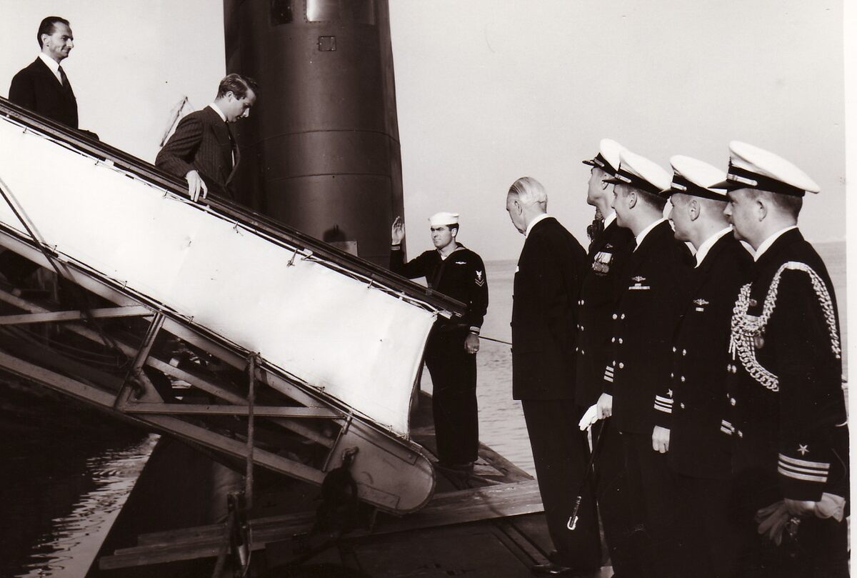 Prins Albert gevolgd door minister van defensie Arthur GILSON gaat aan boord van de Amerikaanse atoomduikboot U.S.S. Skate in de haven van Zeebrugge.Hij wordt opgewacht door de Amerikaanse ambassadeur en de officieren van de duikboot.
