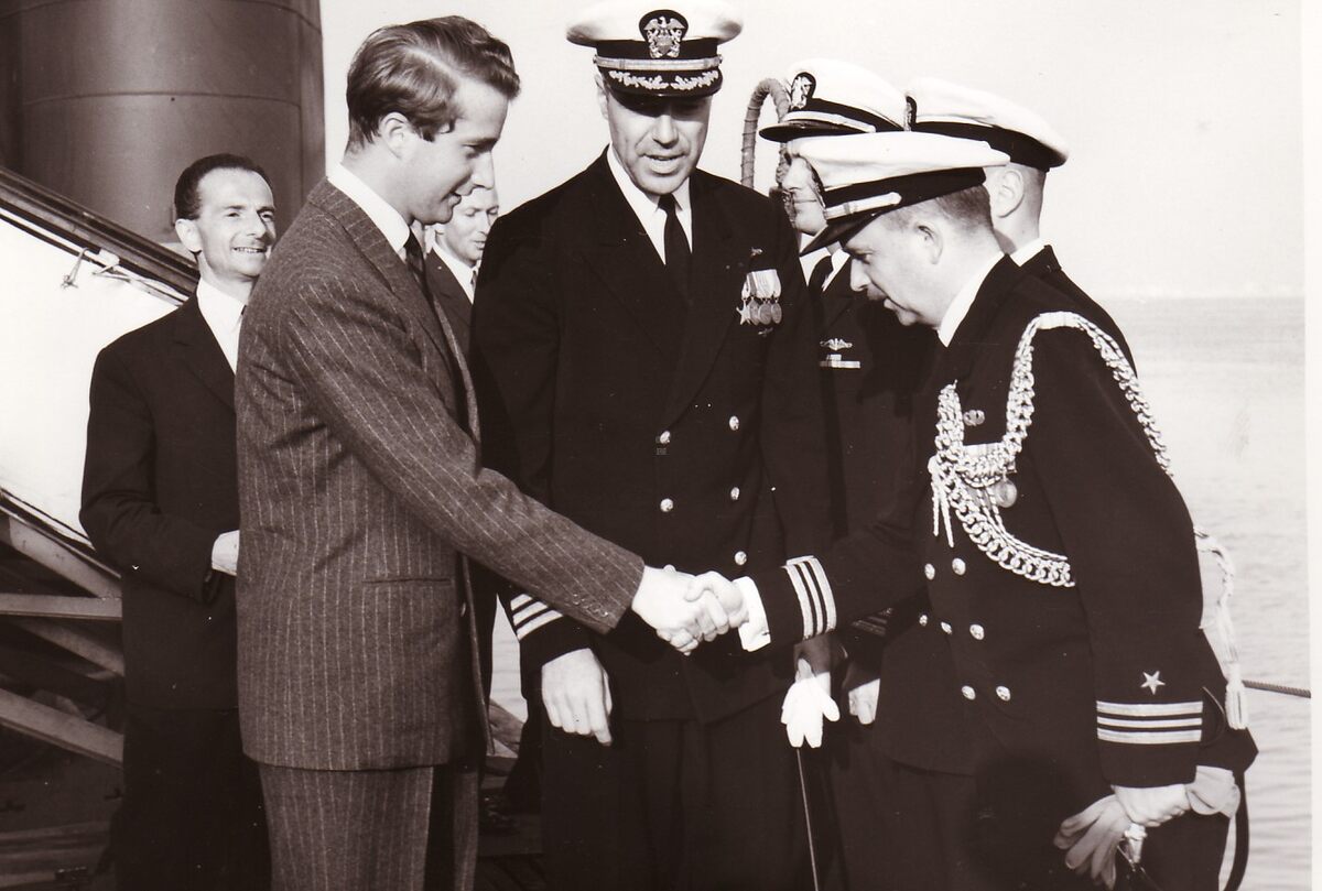 Prins Albert wordt aan boord van de Amerikaanse atoomduikboot U.S.S. Skate voorgesteld aan zijn officieren door commandant CALVERT.Achter de prins de minister van defensie Arthur GILSON.