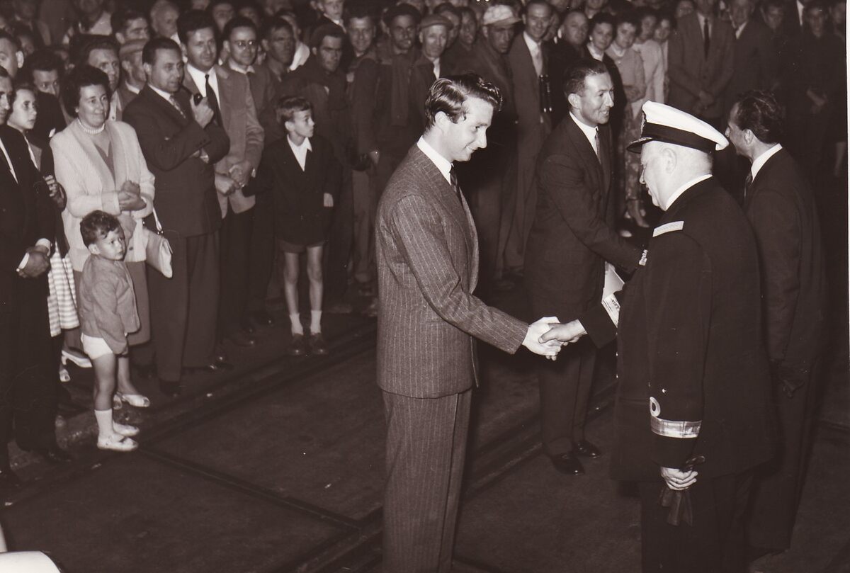Prins Albert schudt de hand van commodore Lambert ROBINS.