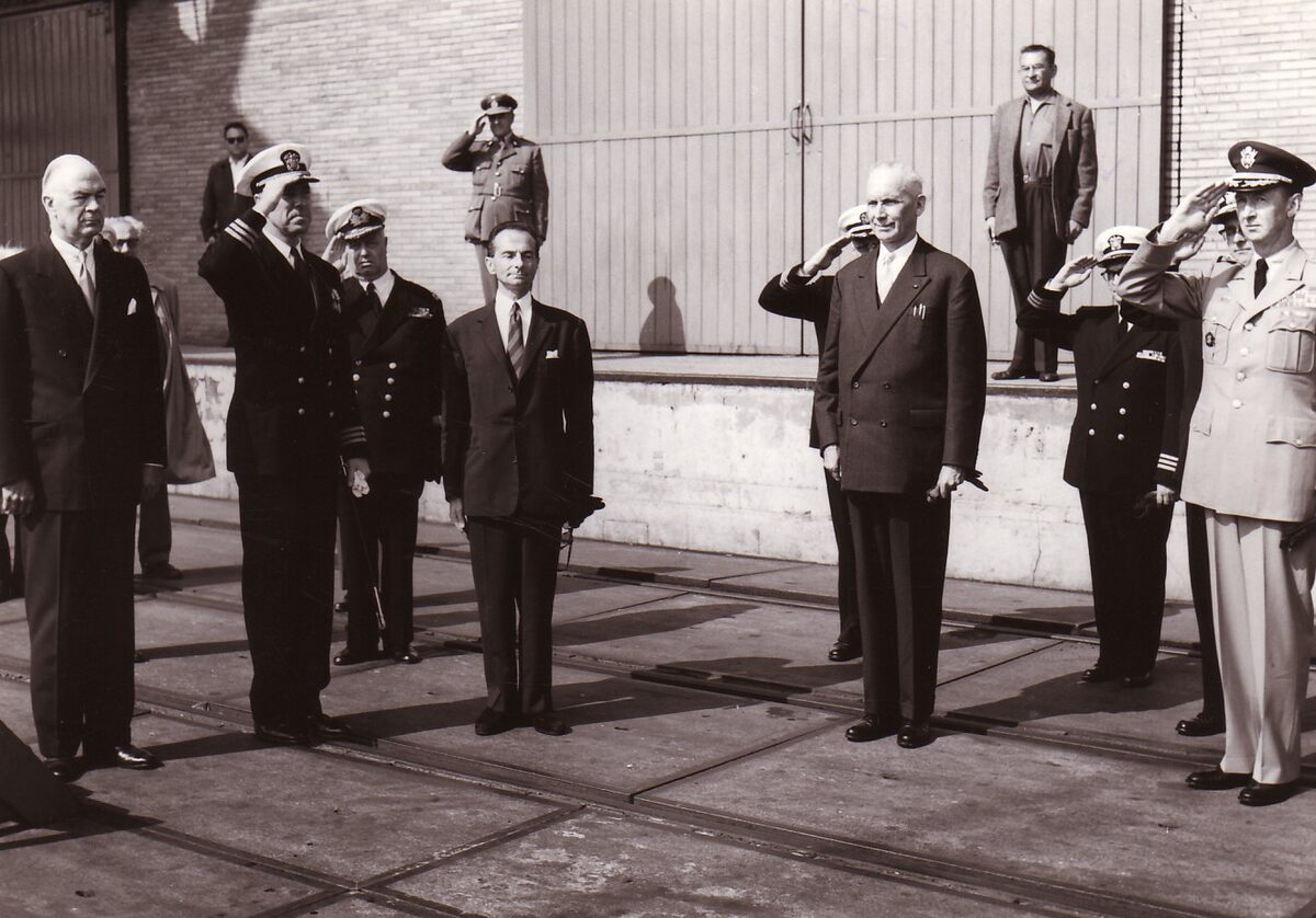 Zeebrugge.Commandant CALVERT (tweede van links) van de Amerikaanse atoomduikboot U.S.S. Skate,naast hem Arthur GILSON,Belgisch minister van defensie met diverse Belgische en Amerikaanse kopstukken.Op de achtergrond groet een lid van de douane mee.