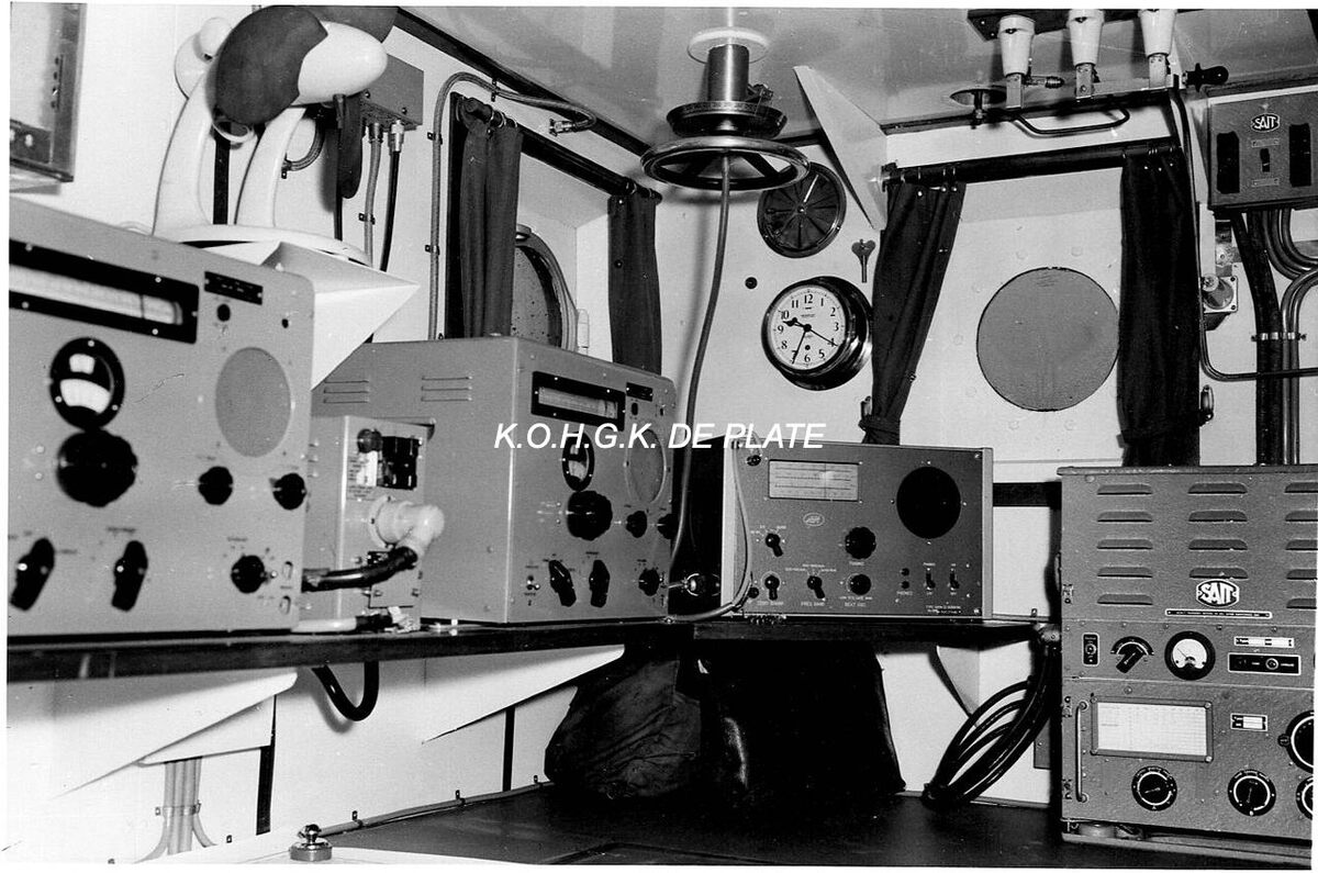 Map 2009/0840-7. - Zicht in de radiohut met radio- en telegrafie toestellen en richtingszoeker van het merk SAIT, Société Anonyme International de Télégraphie sans file. Het wiel tegen het plafond is de bediening van de richtingszoeker antenne. De drie witte isolatoren dienen om de zend- en ontvangstantenne af of aan te schakelen.