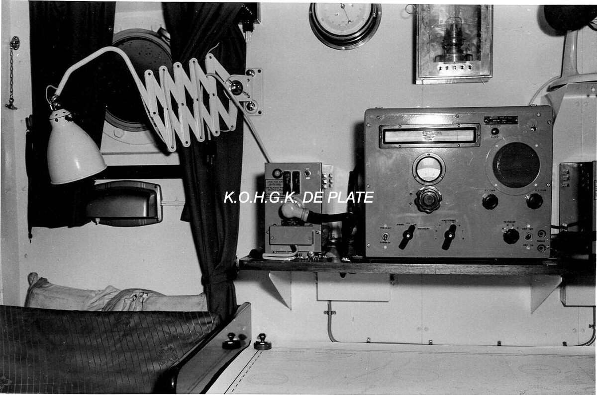 Map 2009/0840-6. - Zicht in de radiohut. In het midden boven de barometer met daarnaast een nood-olielamp. Links het bed (de kooi) met het leeslampje (grijs) onder de patrijspoort. Het bed, alsook de patrijspoort worden afgesloten met, hier, een zwart gordijn. Deze patrijspoort kan opengezet worden (zie draaihendel rechtsboven). De witte accordeonlamp is om het werkblad (bureau) te verlichten.