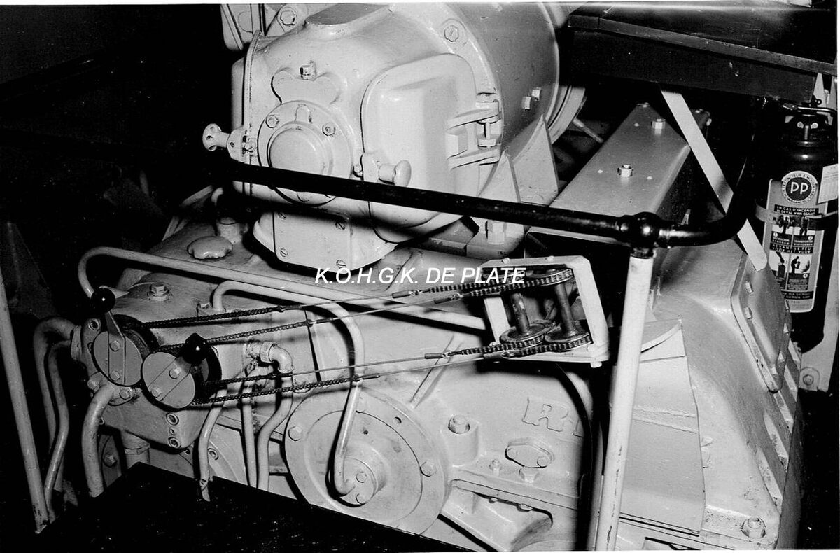 Map 2009/0840-9. - Machinekamer. Zicht op de reductiekast van de hoofdmotor. Een reductiekast werkt op een manier waardoor de ingaande as die te snel draait om de schroef aan te drijven, door middel van een aantal tandwielen de draaisnelheid van de as zo verminderen dat de schroef efficiënt draait. Bovenop de reductiekast staat de hoofddynamo, 110 volt gelijkstroom, die aangedreven wordt door de hoofdmotor.