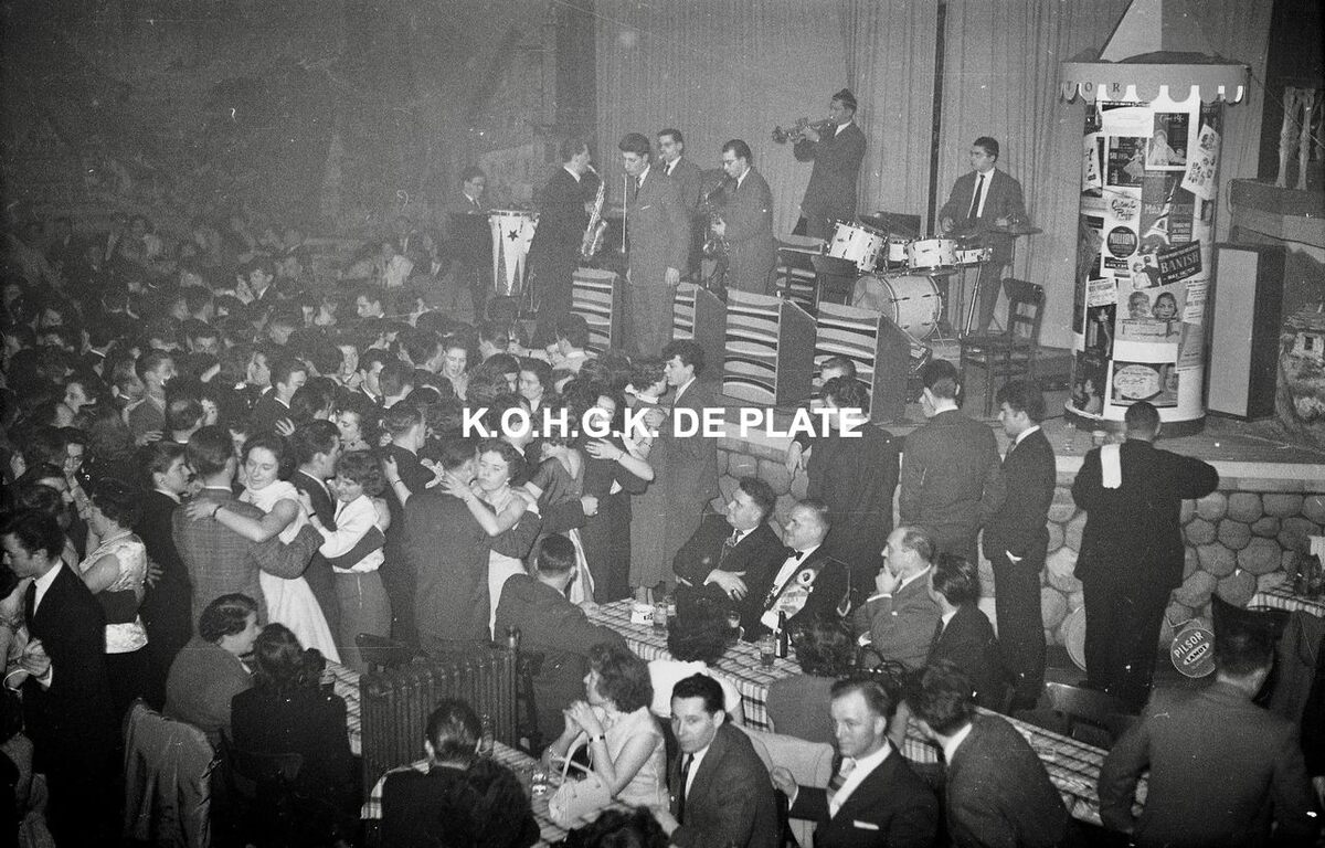 Negatief : 6 x 9 cm. - Altijd ambiance op het Haringbal. Het orkest van Freddy Feys speelt ten dans. Rechts, aan tafel, burgemeester Adolf Van Glabbeke met zijn lint van de Confrerie van de Rat Mort. Straks, moest hij nog naar het Bal du Rat Mort. Aan zijn rechterzijde, carnavalist Norbert Van der Cruyssen