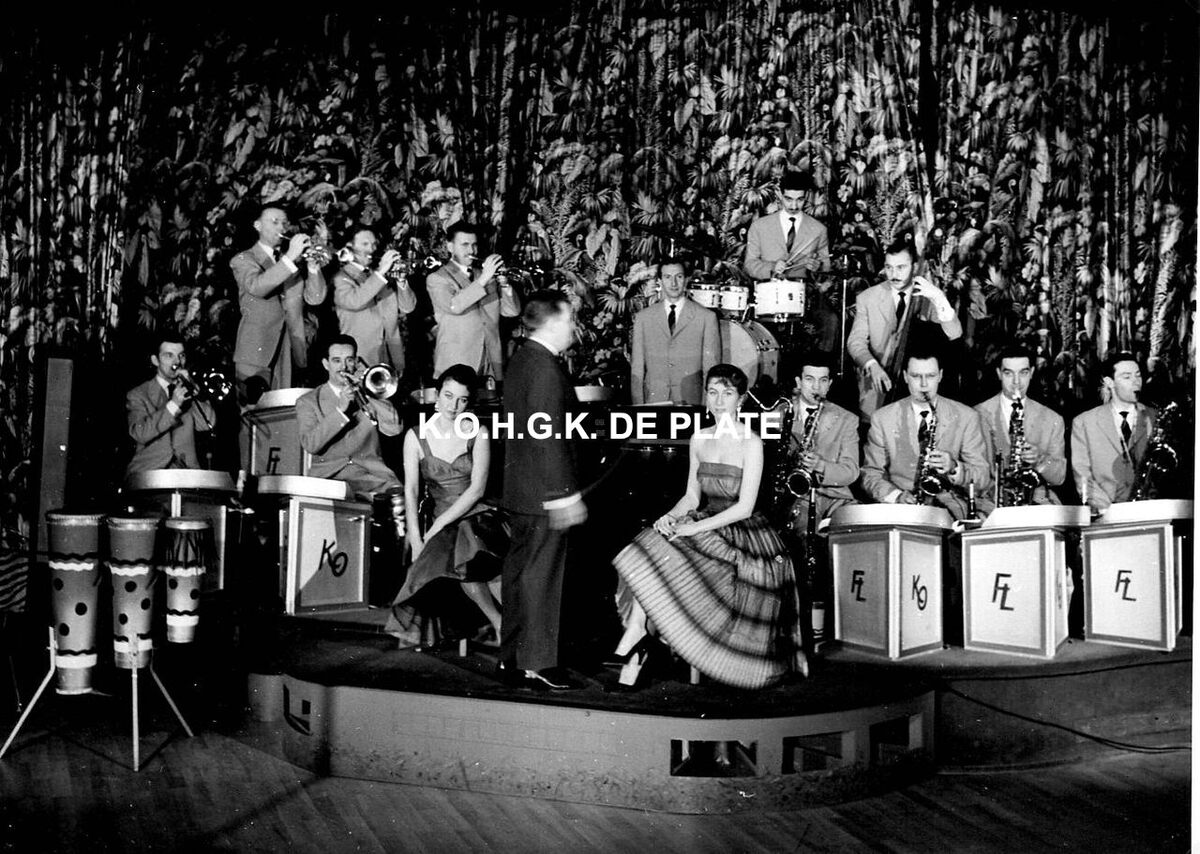 Foto : 13 x 18 cm. - Hier in de nightclub "La Champagne". Bezetting : saxofoonsectie : Henry Vandam, Pierre Bourbousse, Piet Servais en André Gyssens ; trompetsectie : Roy Deckers, Lucien Merchier en Bille Tenroch ; trombonesectie : Paul Bernard en Marcel Catterman ; piano : Franz André ; contrabas : Roger Vanhaverbeke ; drums : Rudy Frankel ; zangeressen : Babe Broke en Linda Kerby ; orkestleider : Franz Lebrun