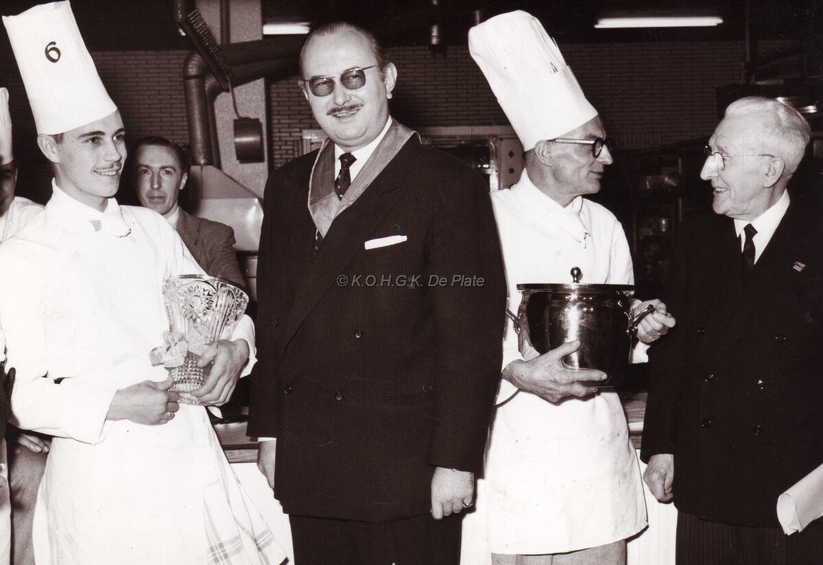 Centraal Roger De Ramée, concessionnaris Casino-Kursaal met links, de winnaar René Kobs van de kookwedstrijd Prosper Montagné ("Beste Kok van België 1960"), met een recept van schaap. Uiterst rechts, Gaston Clement. Foto genomen in de keukens van het Kursaal.