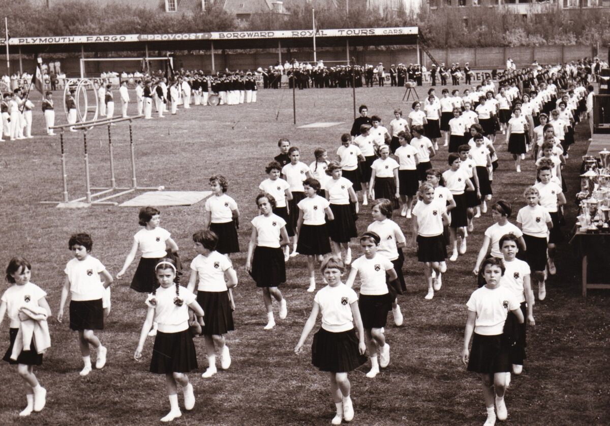 De meisjes van een turnvereniging tijdens een turnfeest op een voetbalveld (A.S.O.?).