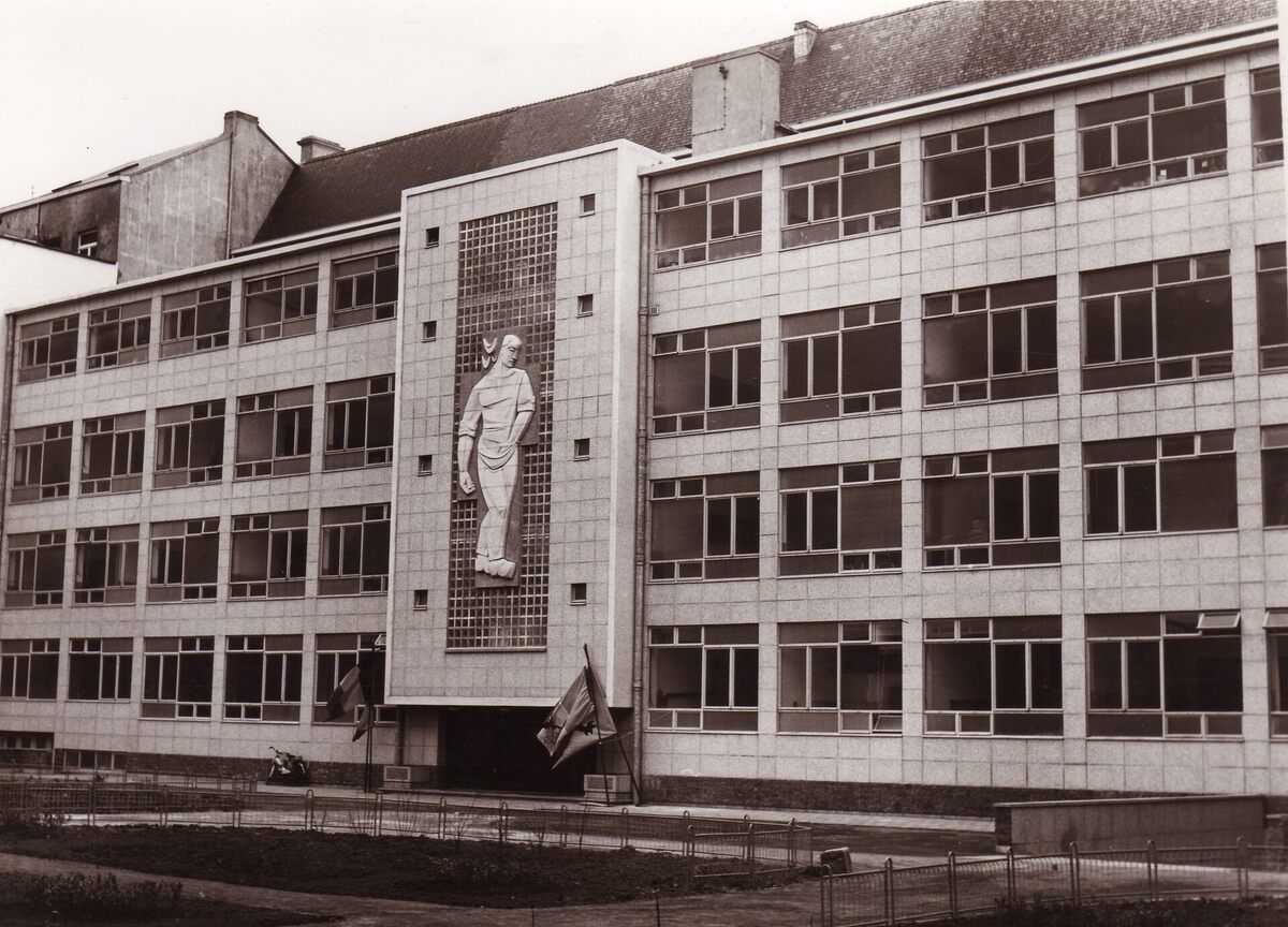 Formaat : 13 x 18 cm. - De gevel met gevelsculptuur De Zaaier van Jo Maes, kant Troonstraat