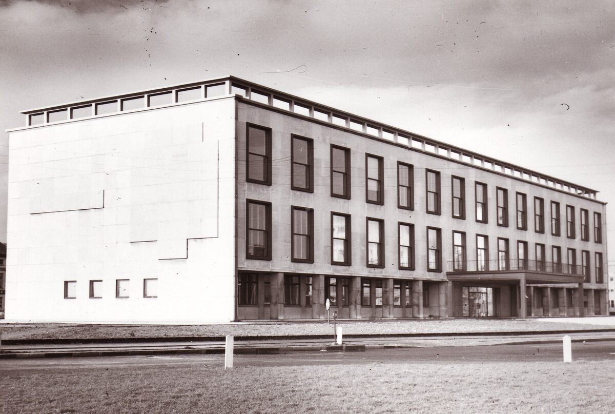Formaat : Het stadhuis gezien kant Leopold II-laan, het basreliëf in de zijgevel met het stadswapen ontworpen door beeldhouwer August Michiels is nog niet aangebracht;