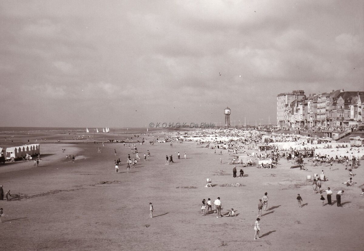 Zeedijk en strand te Middelkerke bij laag water.Links achteraan zeilwagens op het strand,de nog mobiele badhokjes worden naar de waterlijn verplaatst.Rechts in de achtergrond de verdwenen watertoren.