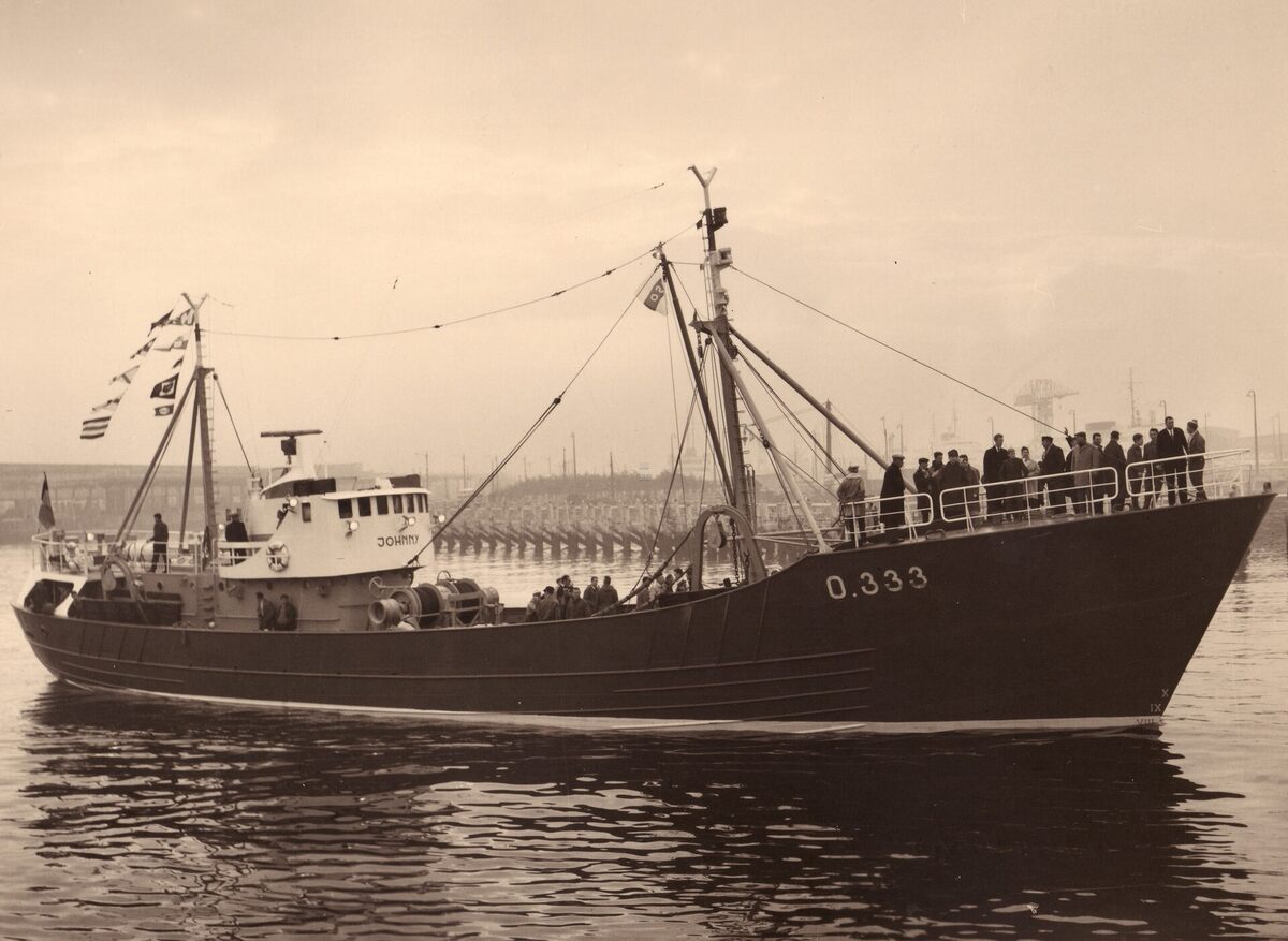 Formaat : 18 x 24 cm. - In de achtergrond links de Vismijn. Op 11 april 1960 werd de O.333 Johnny te water gelaten op de scheepswerf Seghers. Bouwheren zijn de reders-scheepsbouwers Charles en Victor Seghers