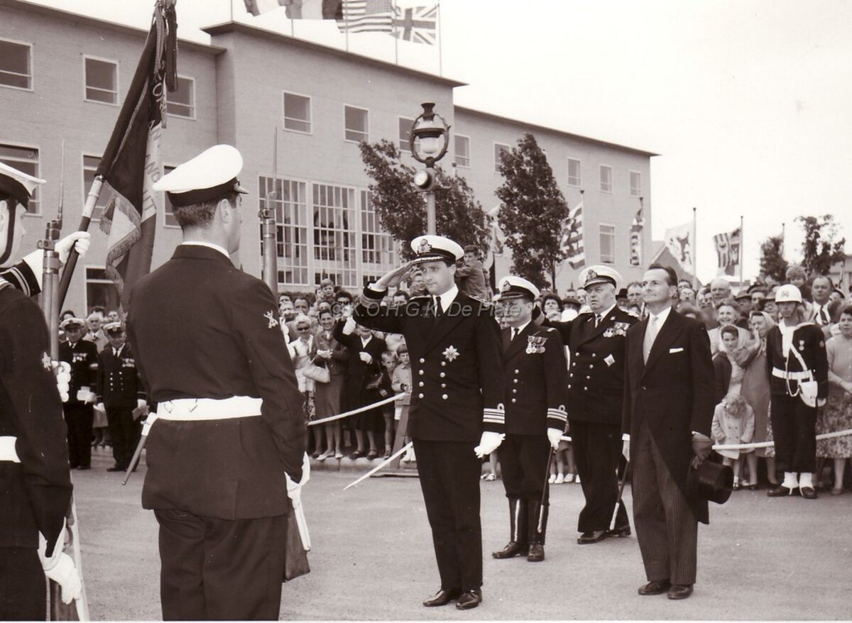 Prins Albert groet het vaandel tijdens een bezoek aan Oostende ter gelegenheid van de inhuldiging van de Ontmijningsschool bij de Bootsman Jonsenkazerne.Rechts van hem Arthur GILSON,minister van defensie.