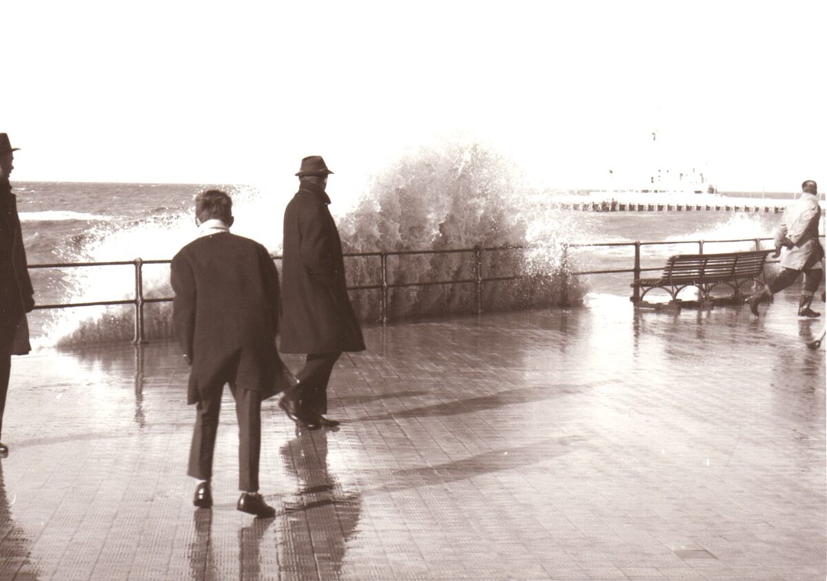 Opspattend water aan de Albert I Promenade bij een flinke bries en hoog tij.Wandelaars genieten van dit nu helaas verdwenen schouwspel.