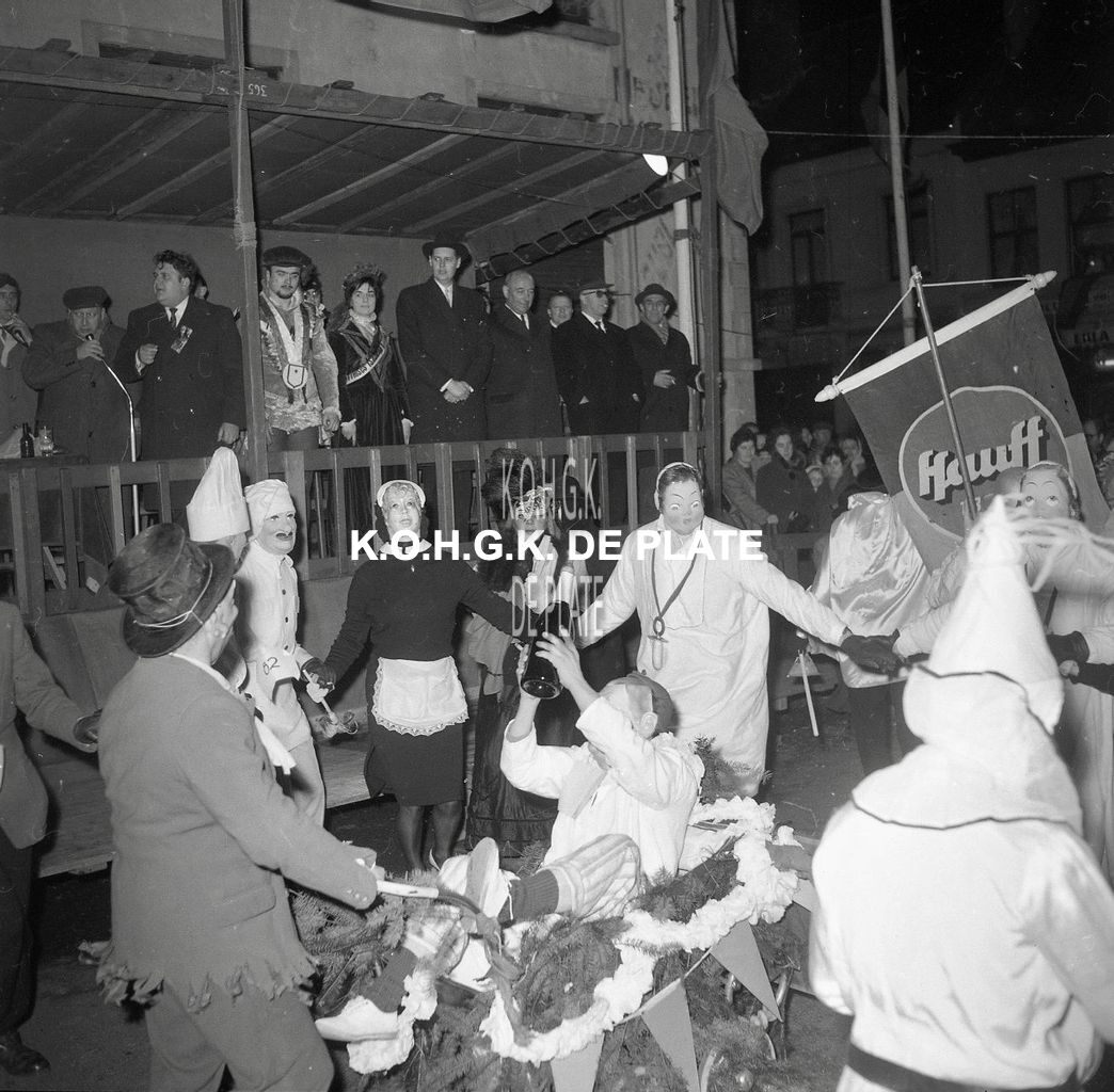 Negatief : 6 x 5,5 cm. - Op de tribune, het prinsenpaar Albrecht en Isabella van Mariakerke 1961. Rechts naast hen, burgemeester Jan Piers en schepen Kamiel Dehouck. Links, Norbert Van der Cruyssen