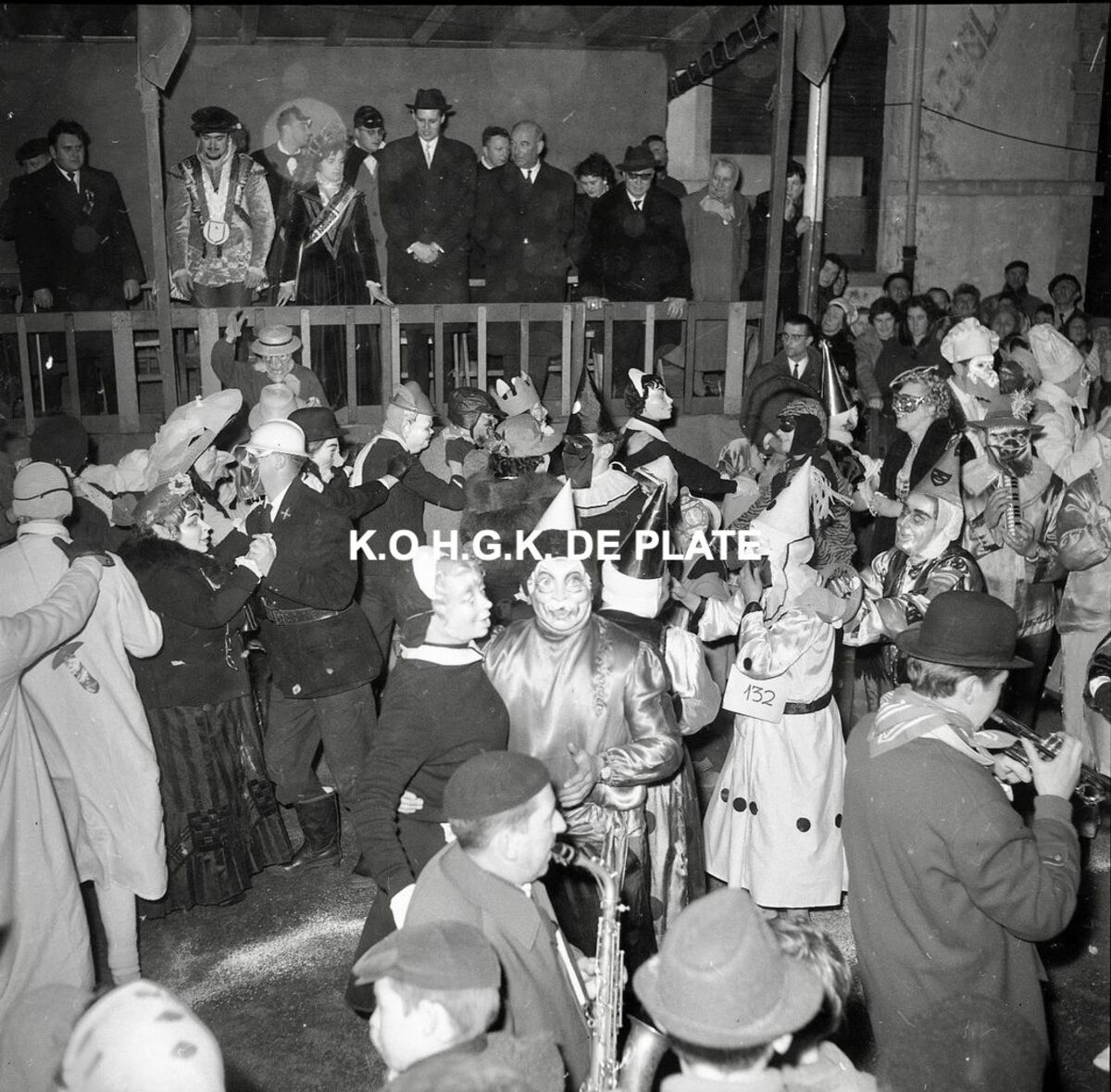 Negatief : 6 x 5,5 cm. - Op de tribune, het prinsenpaar Albrecht en Isabella van Mariakere 1961. Rechts, naast hen, burgemeester Jan Piers en schepen Kamiel Dehouck. Links, Norbert Van der Cruyssen