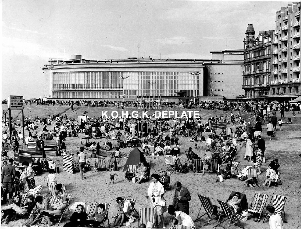 Formaat : 18 x 24 cm. - Strandrecreatie op het Groot Strand. We zien de westgevel van de vierde Kursaal langs de Albert I-promenade. Dit plekje wordt ook "Petit Nice" genoemd, daar het voor de genieters van de zeelucht, bescherming biedt tegen de soms gure noordenwind.