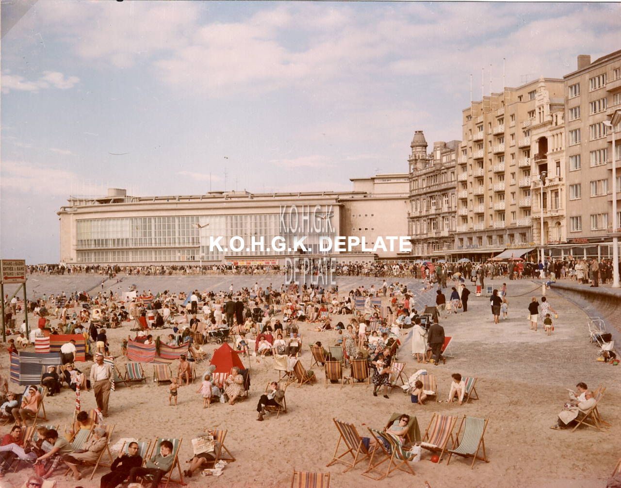 Formaat : 13 x 18 cm. - Strandrecreatie op het Groot Strand. We zien de westgevel van de vierde Kursaal langs de Albert I-promenade. Dit plekje wordt ook "Petit Nice" genoemd, daar het beschutting biedt tegen de soms gure noordenwind