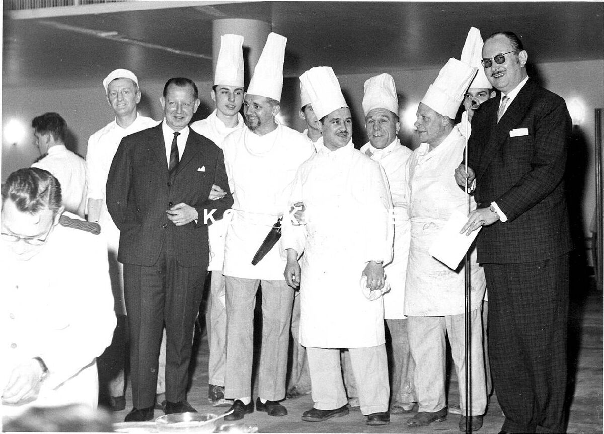 Formaat : 13 x 18 cm. - Het keukenpersoneel dat ook instond voor de gastronomische weekends seizoen 1960 - 1961. De man met zijn keukenmes om zijn middel is meesterkok Arthur Vandenbrouck. Rechts, Roger De Ramée, directeur van het Kursaal.