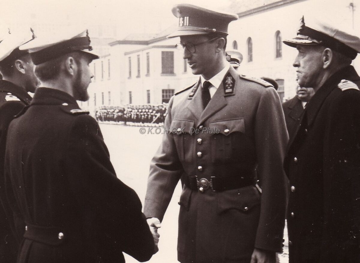 Formaat : 13 x 18 cm. - Koning Boudewijn in de Kazerne Generaal Mahieu. Rechts, kapitein-ter-zee Jules Delforge