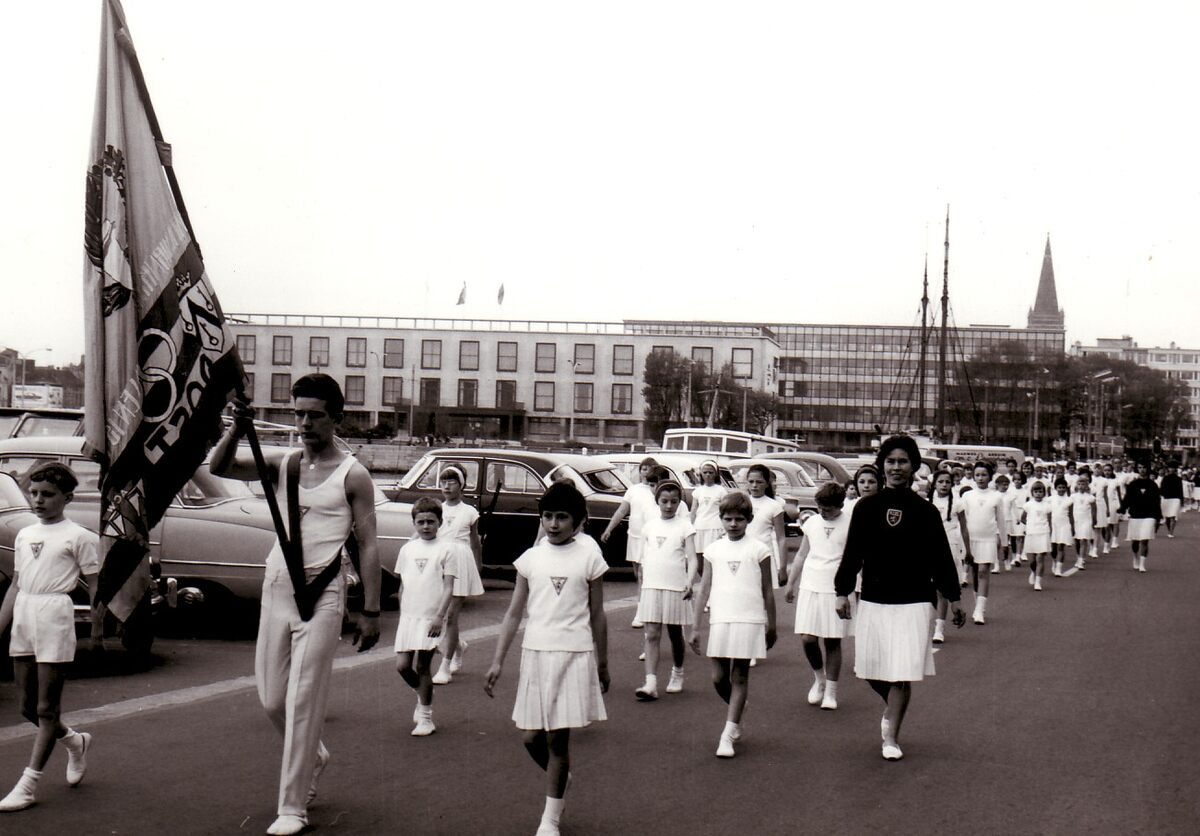 Optocht van de turnvereniging "Willen is Kunnen" met vlag, langs de Vindictivelaan nabij het Tweede Handelsdok. Op de achtergrond, het Stadhuis.