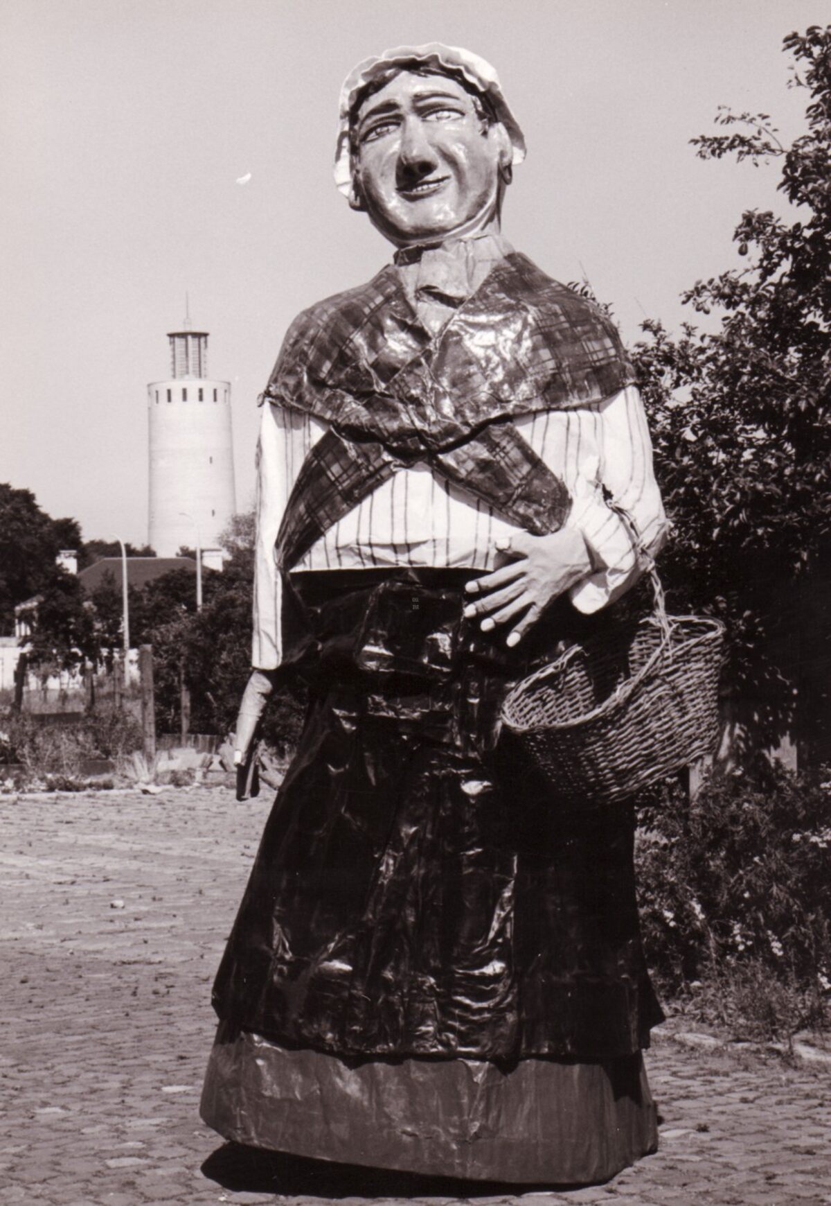 De Oostendse reuzin Fientje, dochter van Tone en Wanne op het terrein van de stedelijke werkhuizen, op de achtergrond de nieuwe watertoren in het Maria-Hendrikapark.