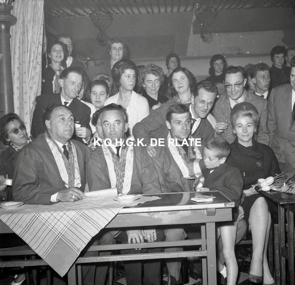 Negatief : 6 x 9 cm. - Van links naar rechts : Lomme Driessens, Frans Therry en Rik Van Looy zijn de nieuwe leden van de "Orde van de Kloeffe". Hier in dancing Carnegie.