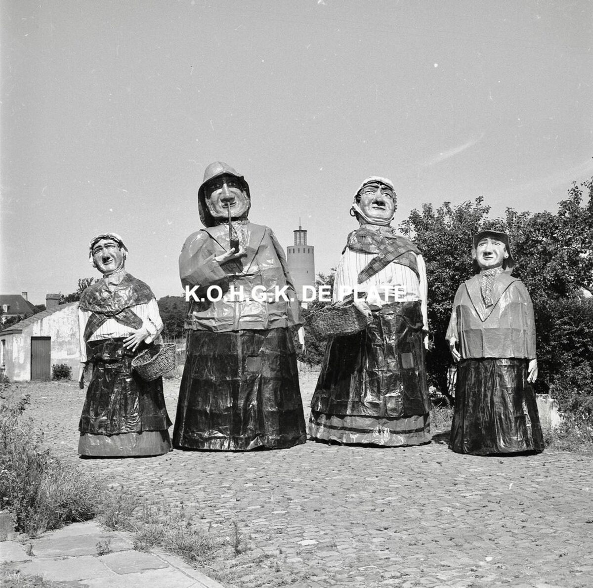 Negatief : 6 x 9 cm. - Van links naar rechts : de Oostendse reuzen Fientje, Tone, Wanne en Tjannie op de terreinen van de Stedelijke Werkhuizen. Op de achtergrond, de watertoren in het Maria-Hendrikapark.