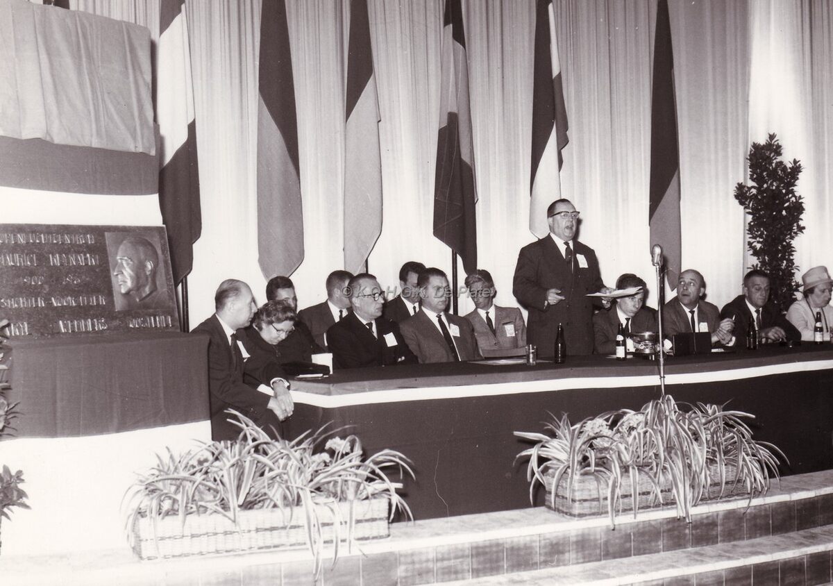 Waarnemend burgemeester John LAUWEREINS houdt een toespraak in de Noordstar tijdens de viering van het 30 jarig bestaan van "De Vrije Zwemmmers". Links vooraan beeltenis van stichter Maurice REYNAERT.