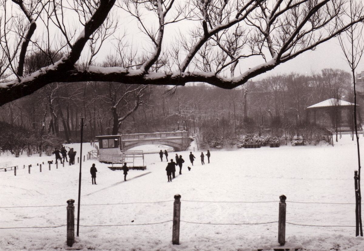 Baantje glijden op de bevroren vijver in het Leopoldpark tijdens de ongemeen strenge winter van 1963.