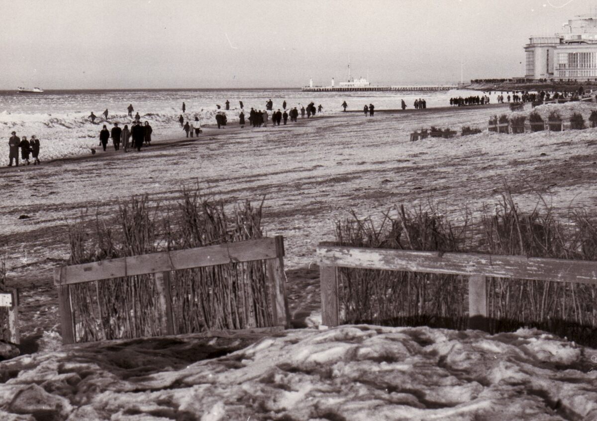 Veel wandelaars op het met ijs bedekt strand voor het kursaal.