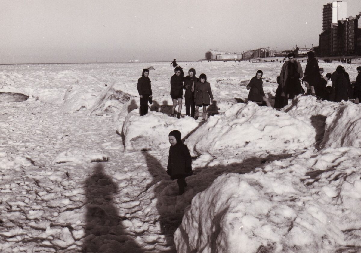 De kinderen amuseren zich rot op het met ijs en sneeuw bedekt strand.