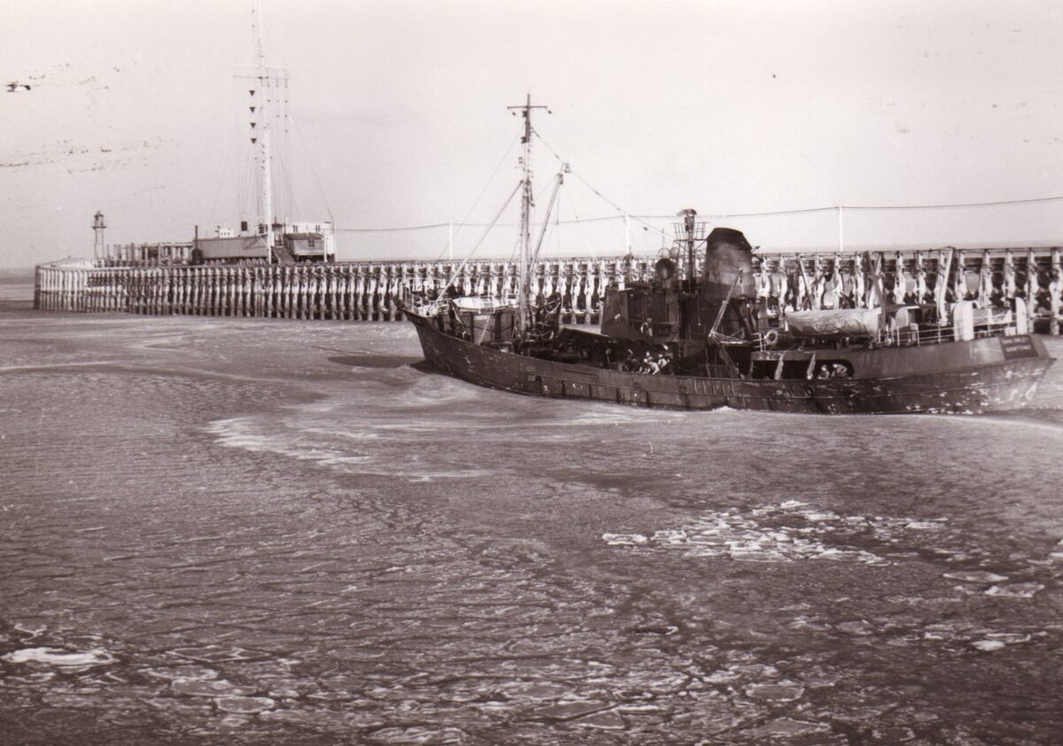 De O.294 "Van Orley" vaart de havengeul, vol ijsschotsen, uit. Op de achtergrond, de tijseinpost op het Ooststaketsel.