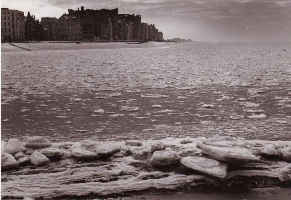 Zicht richting Mariakerke van op het Weststaketsel. Een zee vol ijsschotsen.