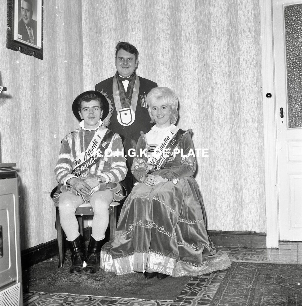 Negatief : 6 x 9 cm. - Het prinsenpaar Albrecht en Isabella van Mariakerke met in hun midden Norbert Van der Cruyssen.