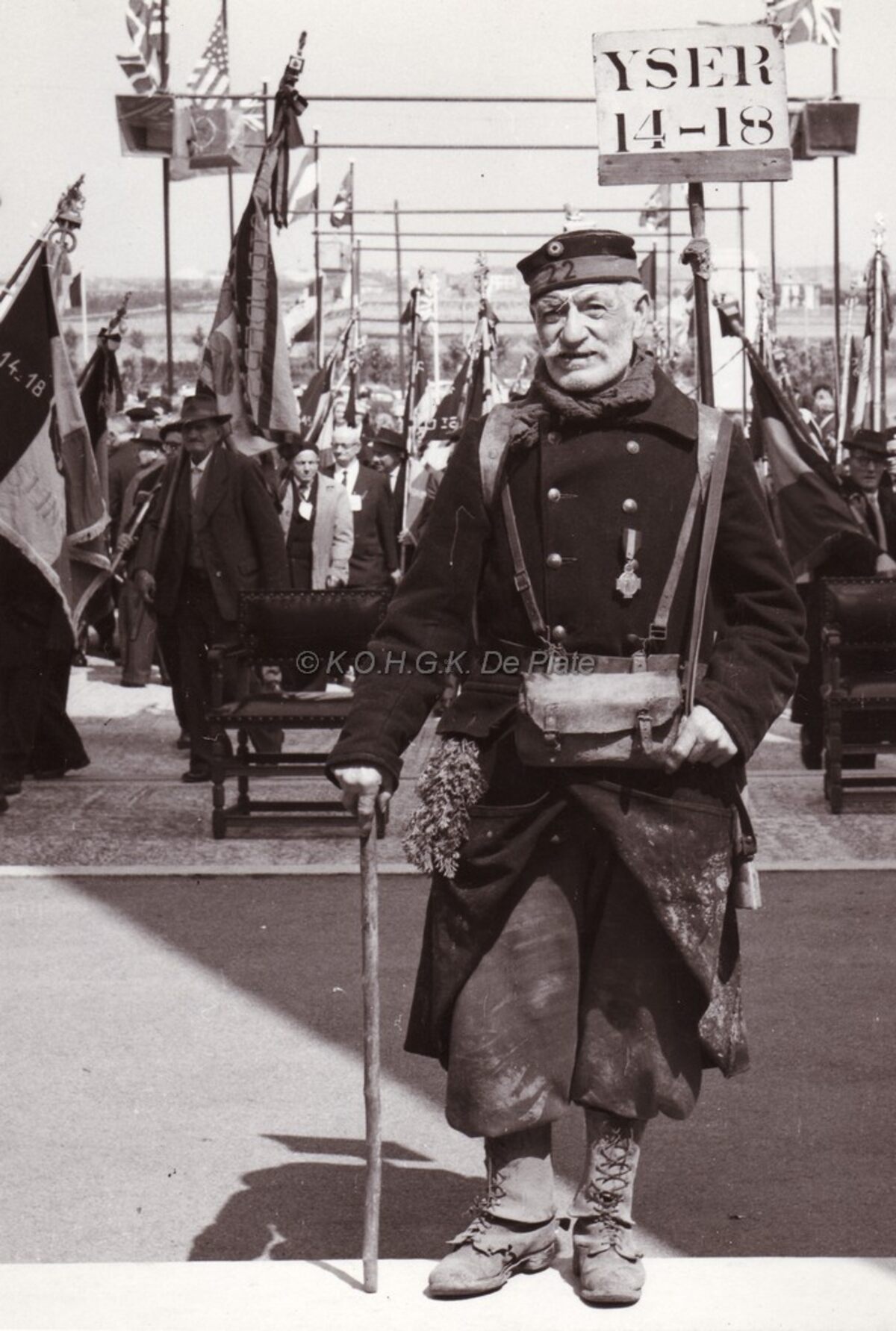 50 jarige herdenking van het begin van de Eerste Wereldoorlog 1914-1918. Een belgisch soldaat of "piot" in het uniform van 1914.