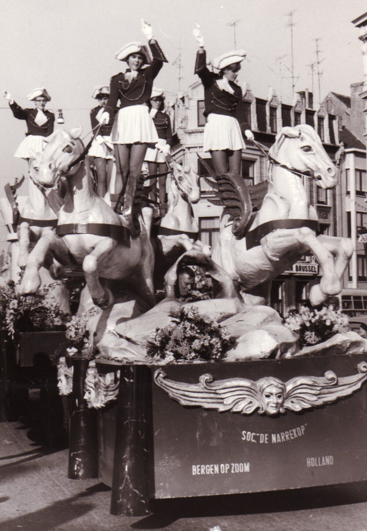 Carnavalstoet.Praalwagen van de societeit "De Narrenkop" uit het Nederlandse Bergen-op-Zoom aan het kruispunt Petit Paris.Rechts de Alfons Pieterslaan.Let op de overvloedig voorkomende TV antennes !