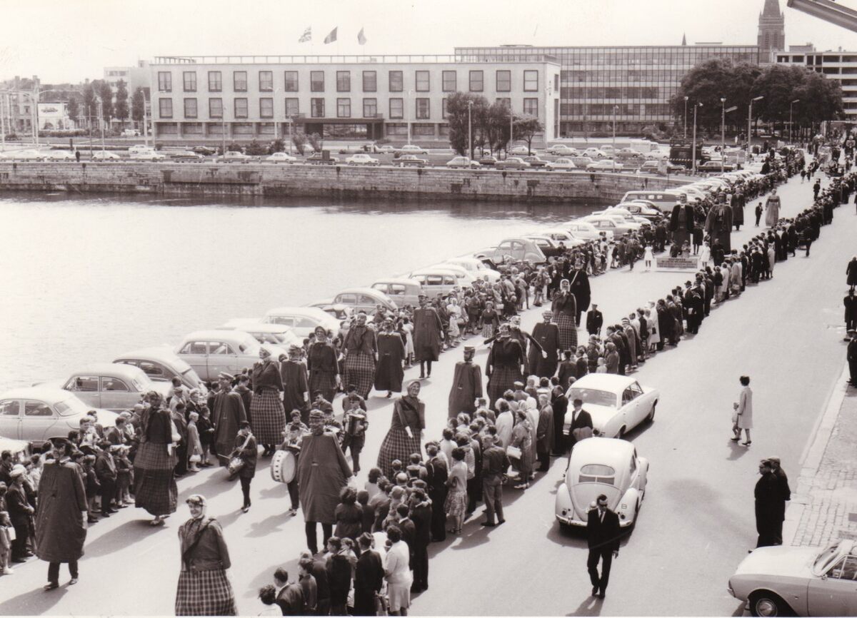 Een carnavalstoet op de Vindictivelaan ter hoogte van de Christinastraat.Het tweede handelsdok is nog volkomen leeg !