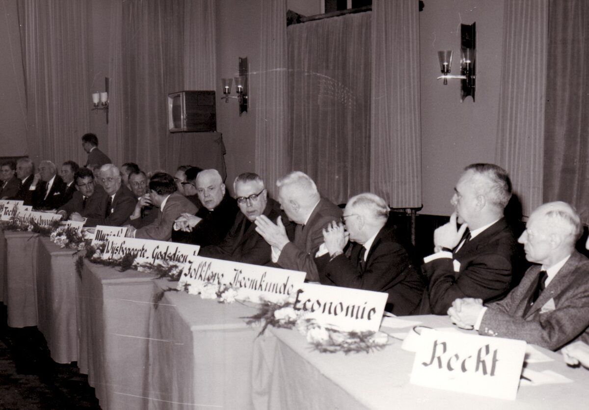 Het TV spel "Eén tegen Allen" in het Feest- en Cultuurpaleis. Vooraan rechts Marie-Jozef PORTA, schepen.