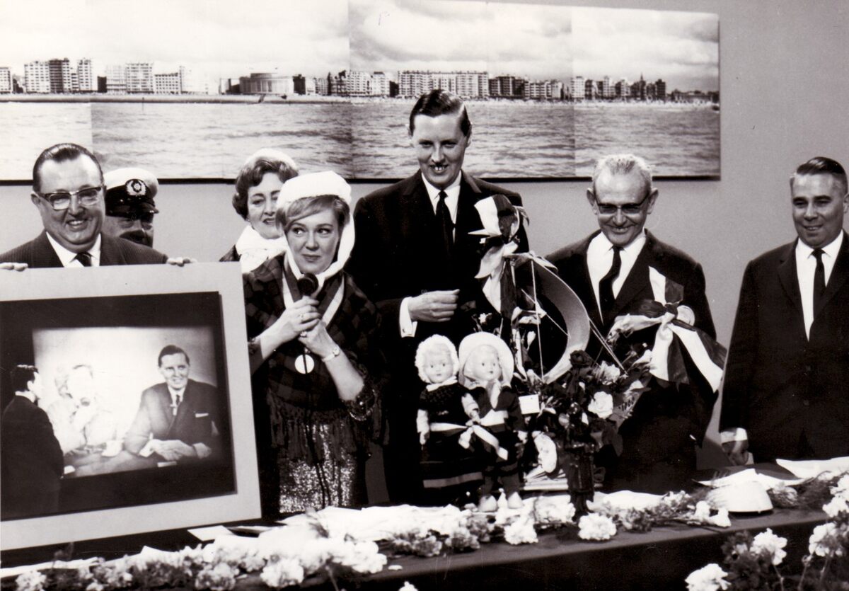 Tijdens het TV spel "Eén tegen Allen. Van links naar rechts John LAUWEREINS, schepen, Jo LEEMANS, presentatrice, Jan PIERS, burgemeester, onbekend en Raymond MIROIR, schepen. "Eén tegen Allen" was een spelprogramma van de BRT, telkens vanuit een andere gemeente of stad, van september 1963 tot 2 mei 1964. De live-uitzendingen werden gepresenteerd door Tony CORSARI.