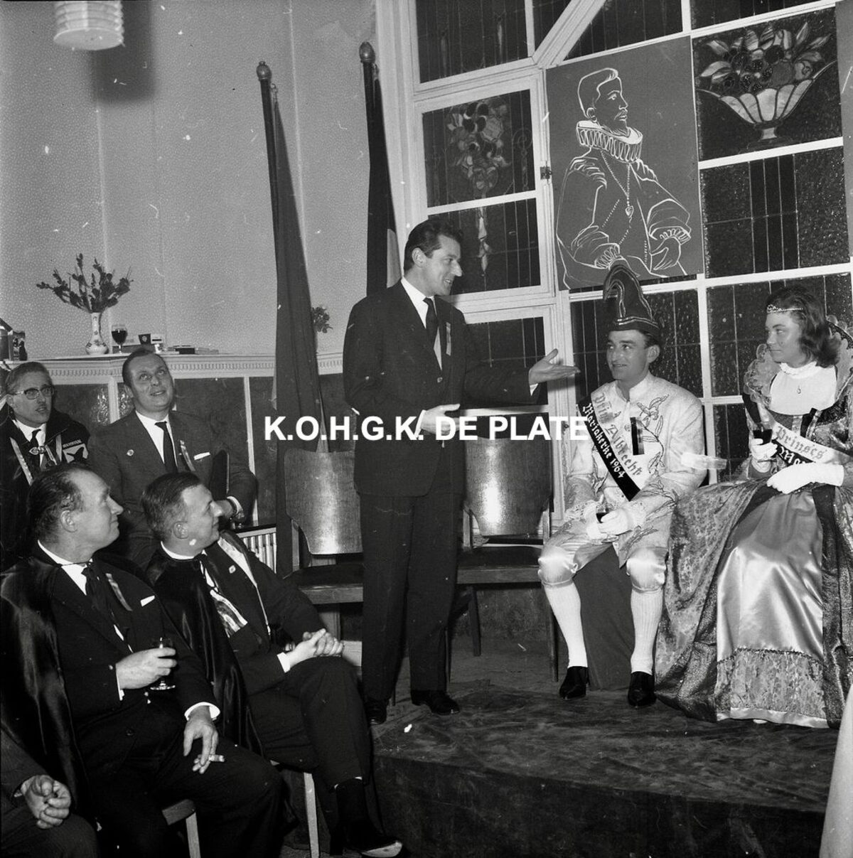 Negatief : 6 x 5,5 cm. - Het prinsenpaar Albrecht en Isabella van Mariakerke 1964. Marcel Friederichs zegt een woordje. Hier in Hotel du Kursaal te Mariakerke.