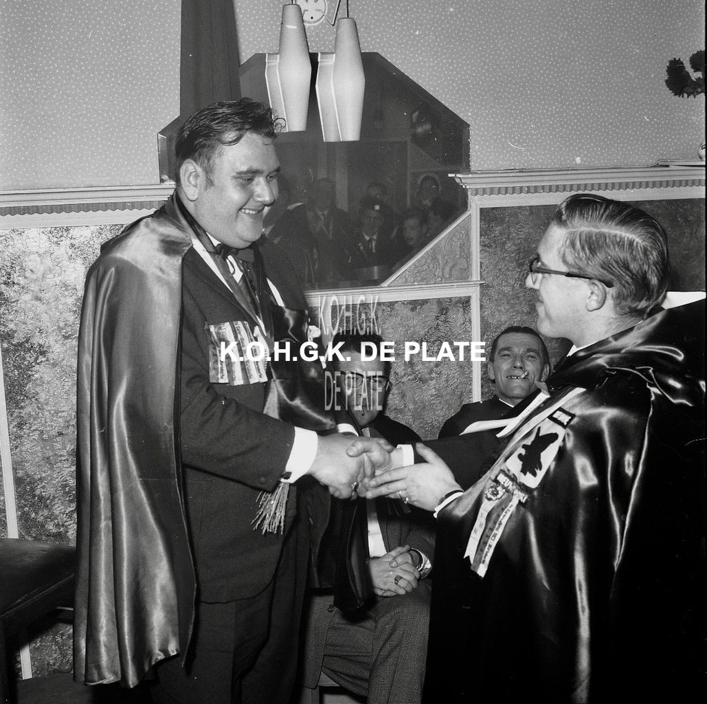 Negatief : 6 x 5,5 cm. - Norbert Van der Cruyssen, van de "Orde der Sombrero's", krijgt felicitaties van (?). Hier in Hotel du Kursaal te Mariakerke.