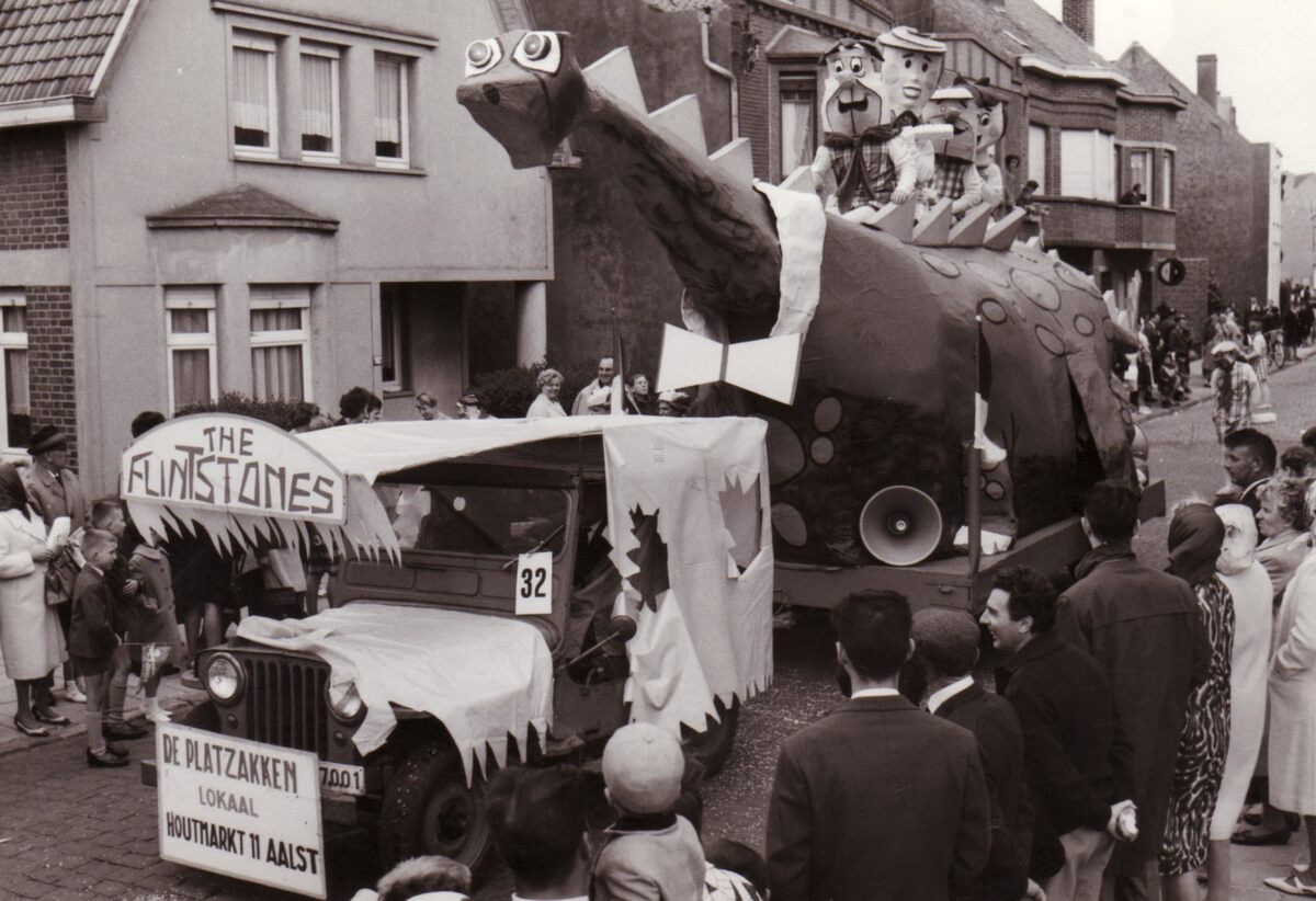 De groep "The Flintstones" uit Aalst in een carnavalstoet te Bredene.