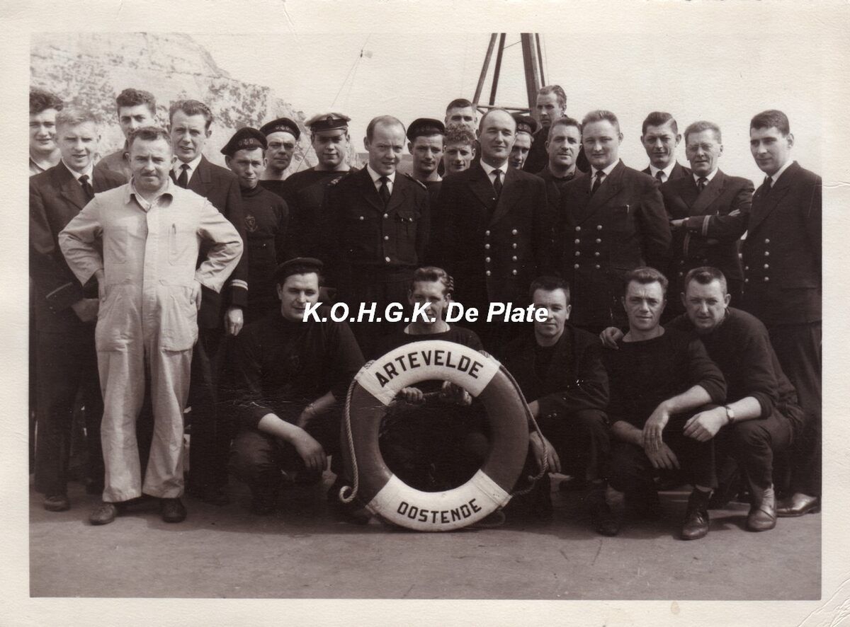 Afdruk, formaat : 29.5 x 21 cm. - Vooraan, staande, de commandanten Walter Defloor en Roland Bedert. Uiterst rechts, chief-steward, A. Brys