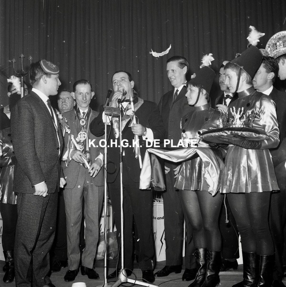Negatief : 6 x 5,5 cm. - Aanstelling van Cis Ier als Prins Carnaval. Gerard Dangreau van de "Orde van de Kloeffe" houdt zijn toespraak. Rechts, burgemeester Jan Piers. Hiet in het Feest- en Cultuurpaleis.