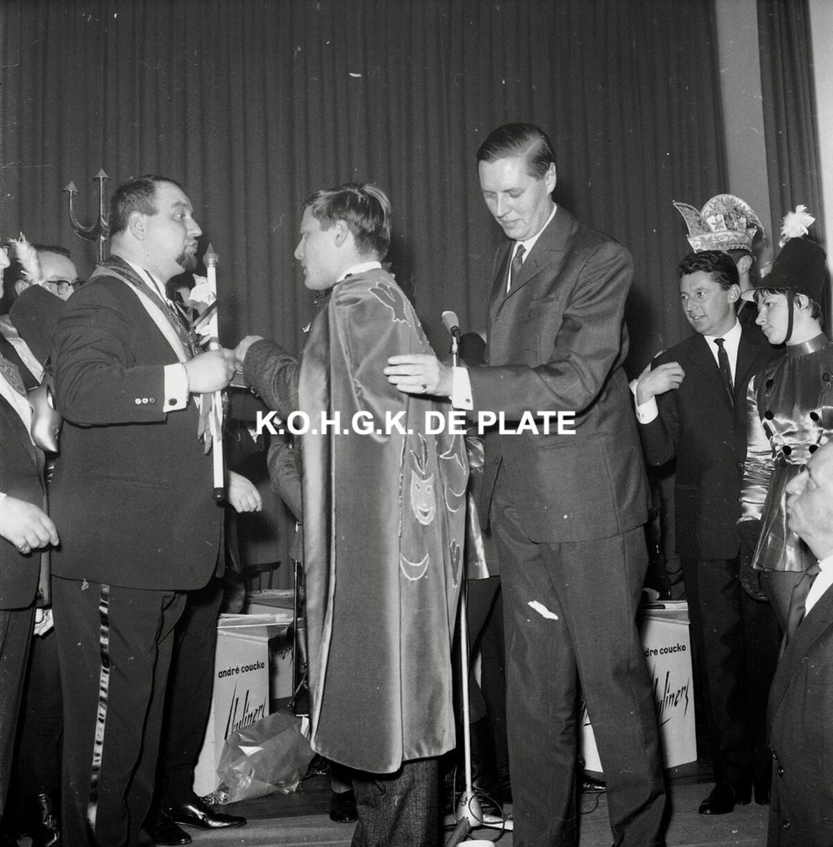 Negatief : 6 x 5,5 cm. - Aanstelling van Cis Ier als Prins Carnaval. Links, Gerard Dangreau van de "Orde van de Kloeffe". Naast de prins, burgmeester Jan Piers. Uiterst rechts, Marcel Friederichs.
