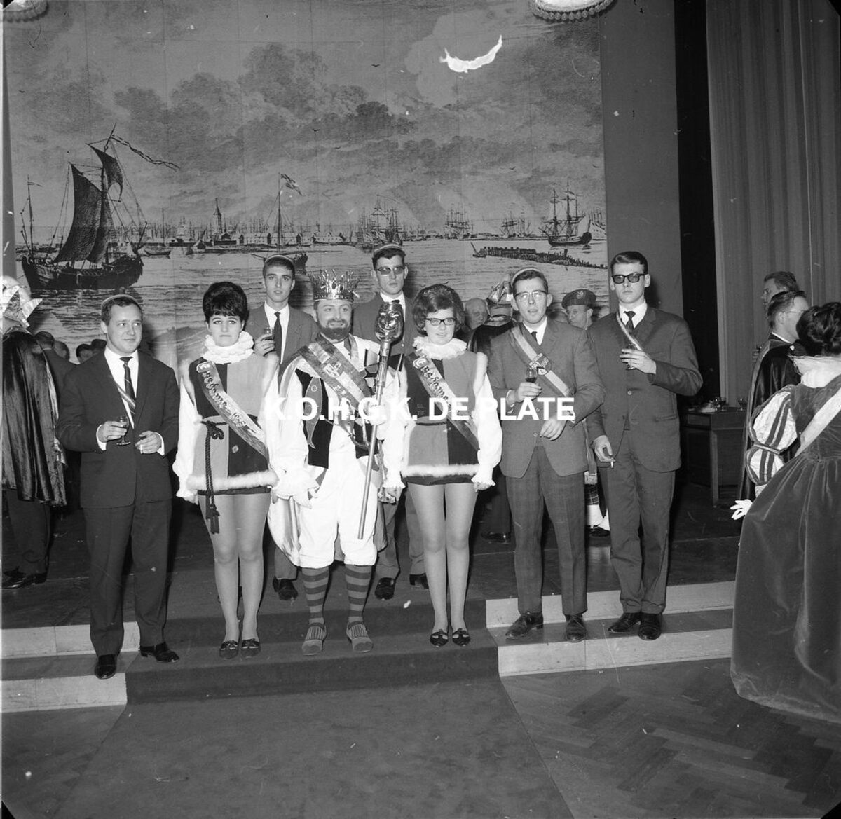 Negatief : 6 x 5,5 cm. - Prins Carnaval van Oostende 1965 met zijn eredames.