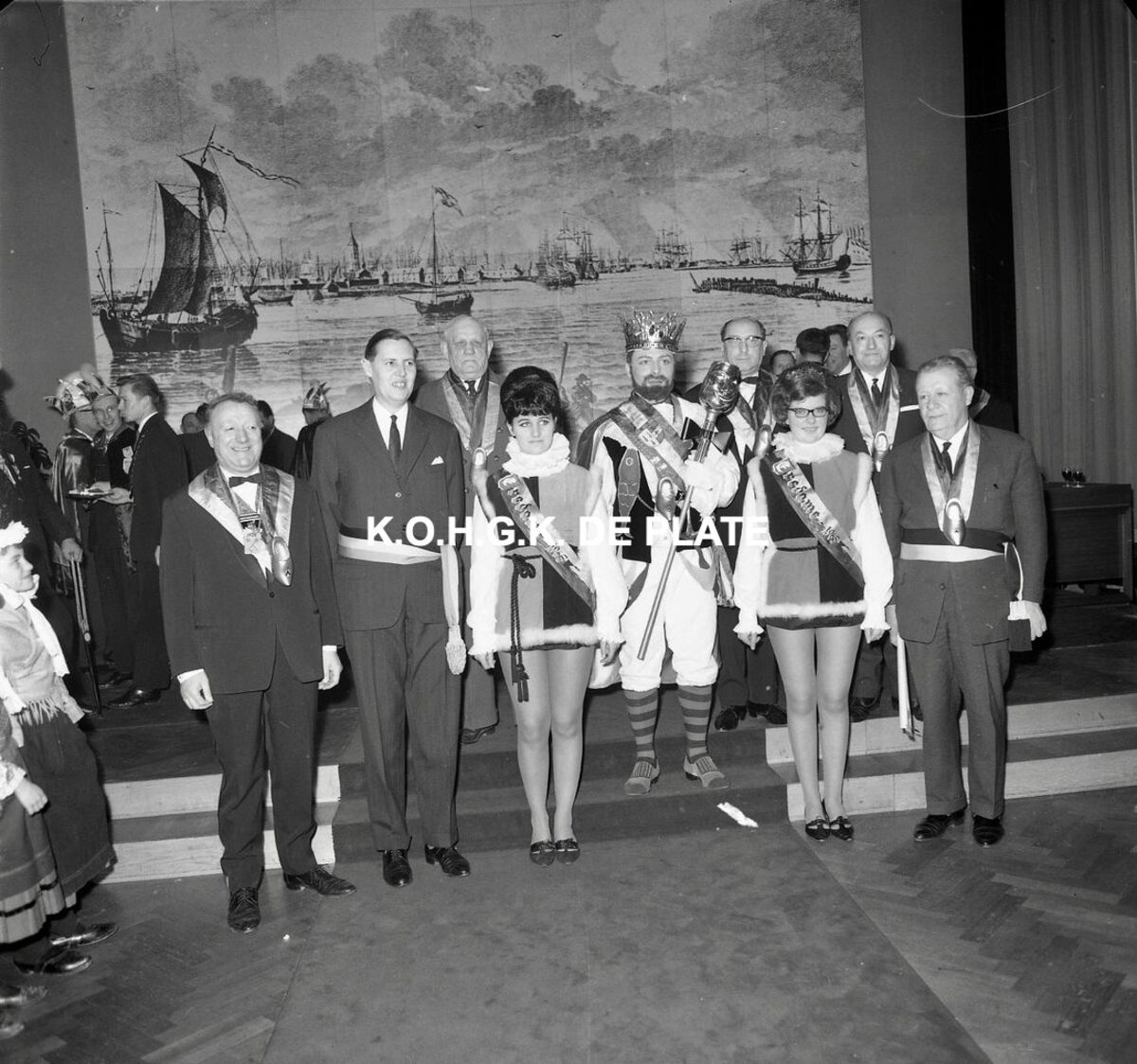 Negatief : 6 x 5,5 cm. - Ontvangst op het stadhuis. Prins Carnaval Oostende 1965 en zijn eredames. Met links, Fernand Monteny en burgemeester Jan Piers en rechts, schepen Jozef Van den Kieboom, allen lid van de "Orde van de Kloeffe".