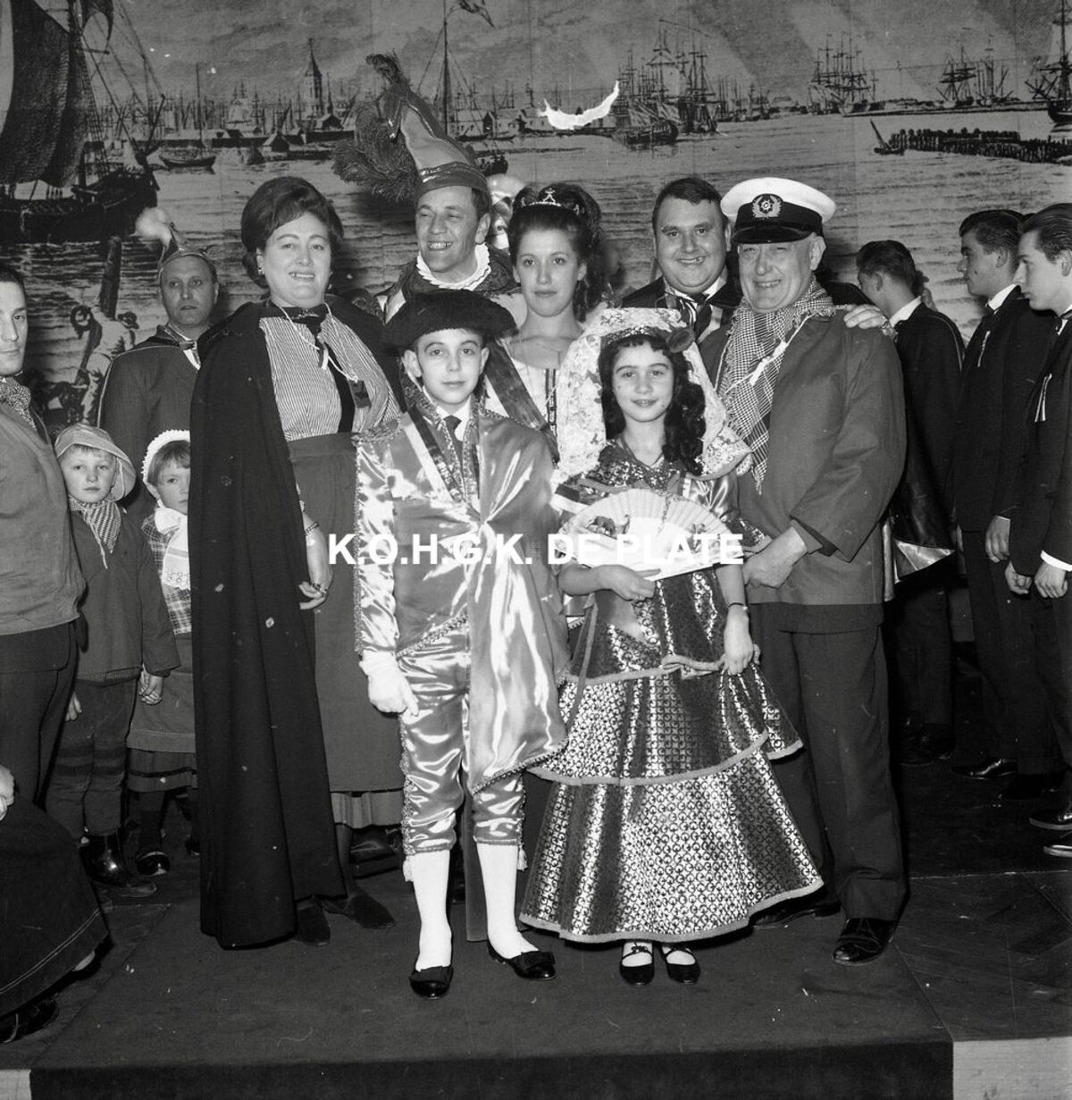 Negatief : 6 x 5,5 cm. - Ontvangst op het stadhuis. - Vooraan, de jeugdprins en -prinses Albrecht en Isabella van Mariakerke 1965, het prinsenpaar Albrecht en Isabella van Mariakerke 1965, in gezelschap van Blanche Belpaeme van de "Orde van de Kloeffe" en rechts achteraan, Norbert Van der Cruyssen van de "Orde der Sombrero's".